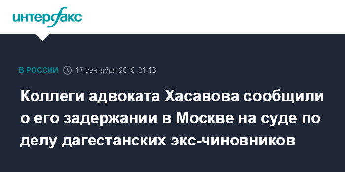 Москва. 17 сентября. INTERFAX.RU - Адвоката Дагира Хасавова задержали в Лефортовском суде Москвы на процессе по уголовному делу в отношении бывших высокопоставленных чиновников Дагестана, сообщил "Интерфаксу" коллега юриста Эдуард Исецкий.