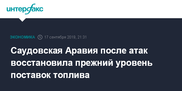"Принц Абдель Азиз бен Сальман сказал (на пресс-конференции - ИФ), что поставки топлива вернулись на прежний уровень - до 3:43 субботы (14 сентября - ИФ) (до атак)", - сообщает телеканал.