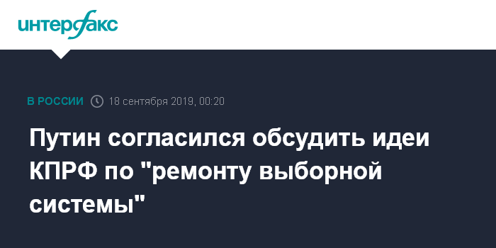 Москва. 17 сентября. INTERFAX.RU - Лидер КПРФ Геннадий Зюганов во время встречи с президентом РФ Владимиром Путиным заявил, что его партия готова подготовить поправки в российскую выборную систему, российский лидер согласился обсудить эту идею, следует из стенограммы, размещенной на сайте Кремля.