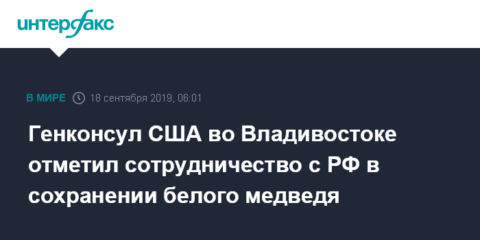 Москва. 18 сентября. INTERFAX.RU - Генеральный консул США на Дальнем Востоке Луис Кришок назвал эффективным сотрудничество РФ и США в сохранении на Дальнем Востоке России, на Чукотке и Аляске белого медведя, занесенного в Красную книгу, говорится в сообщении американского диппредставительства в фейсбуке.