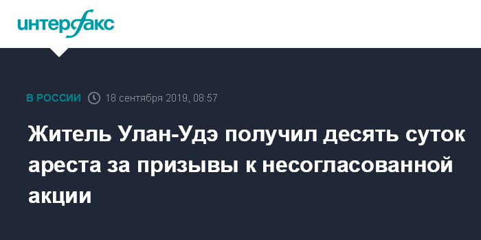 16 сентября по той же статье дали десять суток ареста активисту движения "За священный Байкал" Баиру Цыбикову, который также участвовал в акции протеста 10 сентября, сообщала "Новая газета".