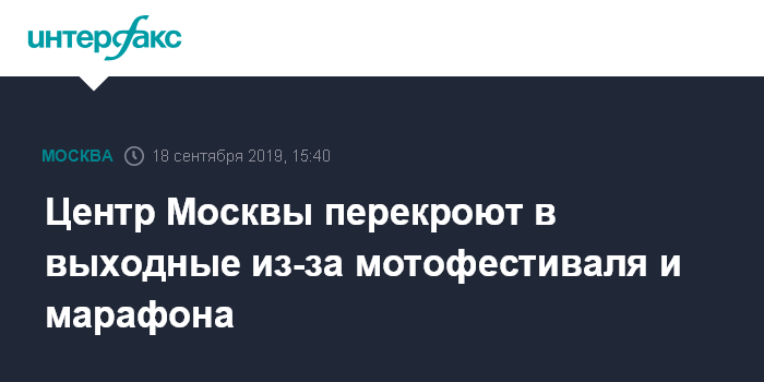 Москва. 18 сентября. INTERFAX.RU - В связи с проведением в предстоящие выходные осеннего мотофестиваля и Московского марафона временно перекроют центральные улицы столицы, сообщили "Интерфаксу" в Центре организации дорожного движения в среду.