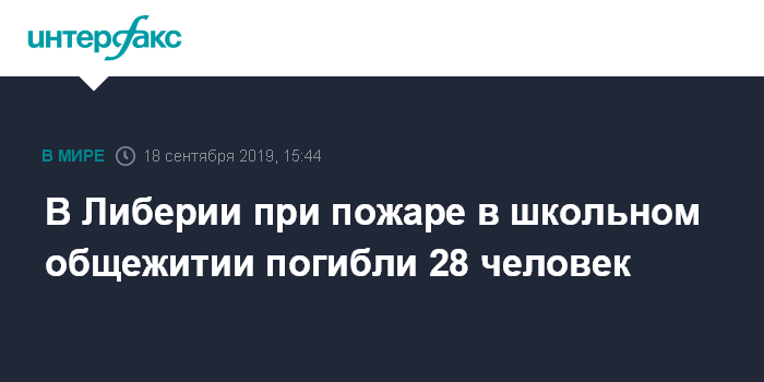 Москва. 18 сентября. INTERFAX.RU - В Либерии в мусульманской школе-пансионате в ночь на 17 сентября произошел пожар и погибли 26 учеников и два преподавателя. Об этом сообщает RFI со ссылкой на пресс-секретаря президента страны Джорджа Веа.