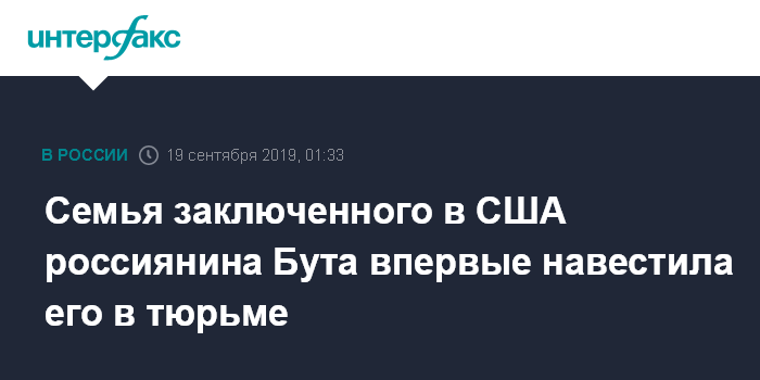 Москва. 19 сентября. INTERFAX.RU - Россиянин Виктор Бут, отбывающий 25-летний срок в США в тюрьме "Марион", впервые за восемь лет встретился с семьей и сможет видеться с родными и в дальнейшем, сообщило в четверг генконсульство РФ в Нью-Йорке.