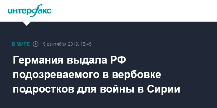 Москва. 19 сентября. INTERFAX.RU - Германия выдала России жителя Северного Кавказа, заочно обвиняемого в попытке вовлечь российских подростков в террористическую организацию в Сирии, сообщили в пресс-службе Следственного комитета РФ (СКР). Об этом говорится в сообщении пресс-службы СКР, поступившем в четверг в "Интерфакс".
