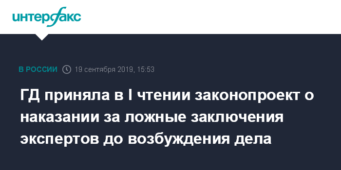 Москва. 19 сентября. INTERFAX.RU - Госдума в четверг приняла в первом чтении поправки в статью 307 Уголовного кодекса РФ о распространении уголовной ответственности за заведомо ложные показания эксперта и переводчика на стадии проверки преступления до возбуждения уголовного дела.