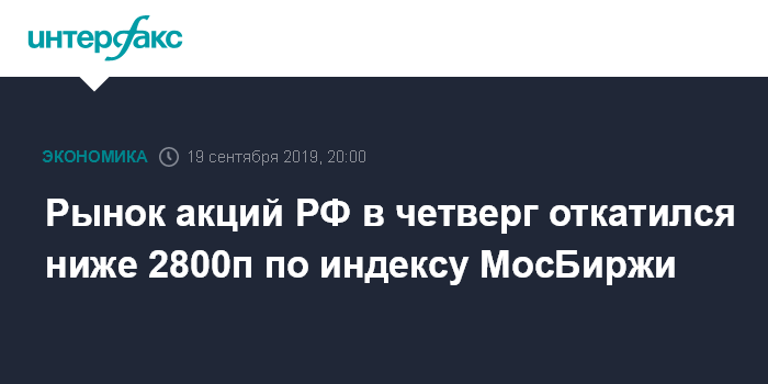 Москва. 19 сентября. INTERFAX.RU - Рынок акций РФ в четверг скорректировался вниз в рамках фиксации прибыли игроками на фоне забуксовавшей в росте нефти и неопределенности с дальнейшей монетарной политикой Федрезерва США, индекс МосБиржи откатился ниже рубежа 2800 пунктов на фоне укрепления рубля.