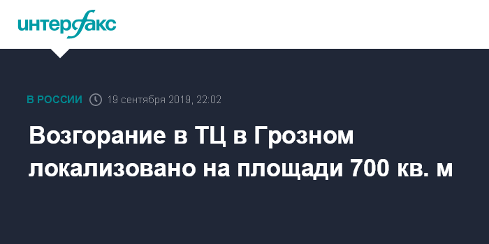 Москва. 19 сентября. INTERFAX.RU - Пожарные локализовали возгорание, возникшее в торговом центре "Гранд Парк" в Грозном, сообщили "Интерфаксу" в пресс-службе МЧС РФ.