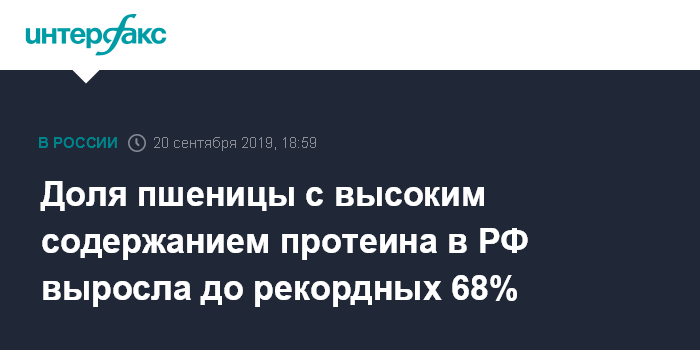 Москва. 20 сентября. INTERFAX.RU - Доля российской пшеницы с высоким содержанием протеина (от 12,5%) в 2019 году выросла до 68% от ее общего урожая с 34% в 2018 году, свидетельствуют данные Центра оценки качества зерна (структура Россельхознадзора).