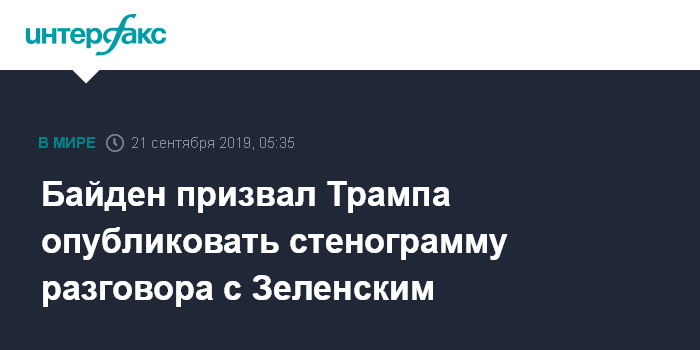 "По меньшей мере, Трампу следует немедленно предоставить стенограмму звонка, о котором идет речь, и позволить американскому народу самому судить (о содержании разговора - ИФ), а также поручить офису директора Национальной разведки перестать блокировать (жалобу на Трампа - ИФ) и представить сообщение осведомителя Конгрессу США", - говорится в заявлении Байдена.