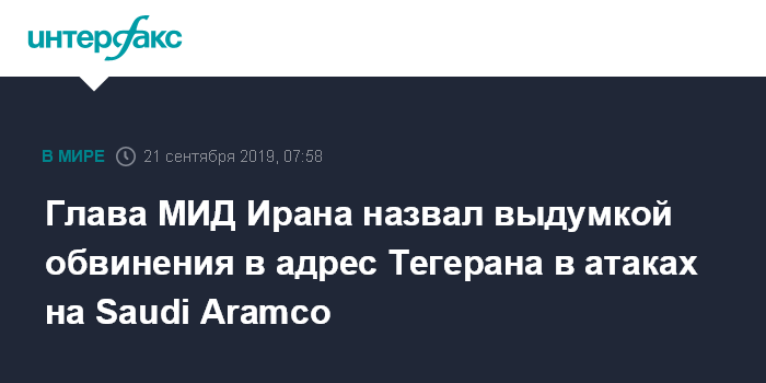 Москва. 21 сентября. INTERFAX.RU - Власти Саудовской Аравии, обвинившие Иран в атаке на нефтяные объекты Saudi Aramco, сами не верят в причастность Тегерана к нападениям, считает министр иностранных дел Ирана Мохаммад Джавад Зариф.