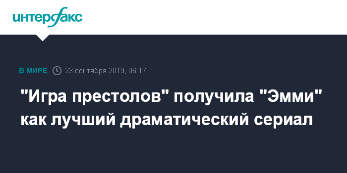 Москва. 23 сентября. INTERFAX.RU - "Игра престолов" получила премию "Эмми" в номинации лучший драматический сериал. Трансляцию 71-й церемонии вручения награды вел телеканал Fox.
