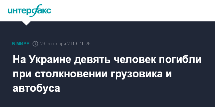 Москва. 23 сентября. INTERFAX.RU - В результате столкновения грузовика с автобусом на западе Житомирской области на Украине погибли девять человек. Еще 10 получили травмы и были доставлены в районную больницу.