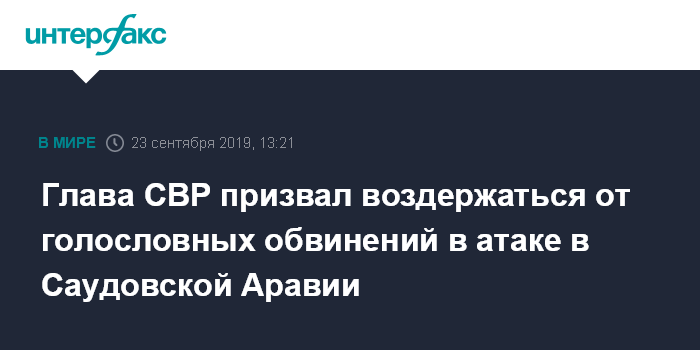 Москва. 23 сентября. INTERFAX.RU - Глава Службы внешней разведки (СВР) РФ Сергей Нарышкин считает недопустимыми голословные обвинения какой-либо страны в атаках на объекты саудовской нефтяной инфраструктуры.