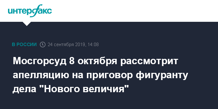 Мосгорсуд 8 октября рассмотрит апелляцию на приговор фигуранту дела "Нового величия"