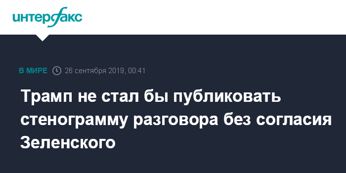 Москва. 26 сентября. INTERFAX.RU - Президент США Дональд Трамп в среду заявил, что не опубликовал бы стенограмму разговора с президентом Украины Владимиром Зеленским, если бы в Киеве были против этого.