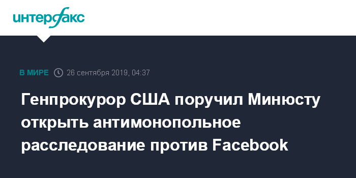 Москва. 26 сентября. INTERFAX.RU - Министерство юстиции США начнет расследование против Facebook в связи с предполагаемыми нарушениями антимонопольного законодательства, соответствующее поручение дал американский генпрокурор Уильям Барр, сообщает Bloomberg со ссылкой на источники.