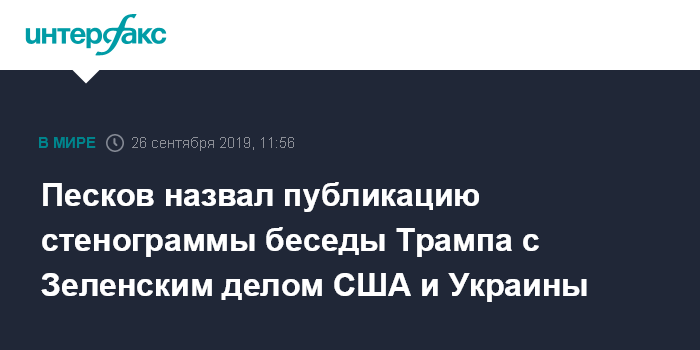 Москва. 26 сентября. INTERFAX.RU - Пресс-секретарь президента РФ Дмитрий Песков заявил, что публикация стенограммы разговора президентов США и Украины Дональда Трампа и Владимира Зеленского является внутренним делом этих государств, но подобное в дипломатической практике встречается нечасто.