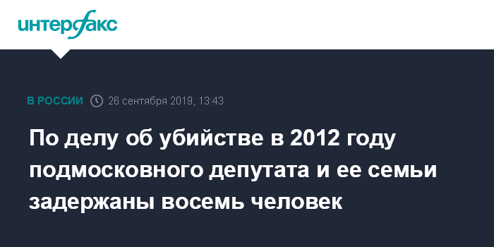 Москва. 26 сентября. INTERFAX.RU - Сотрудники правоохранительных органов задержали восемь подозреваемых по делу о похищении и убийстве в 2012 году депутата Законодательного собрания Раменского района Подмосковья Татьяны Сидоровой и членов ее семьи.