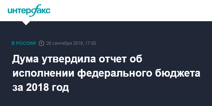 Москва. 26 сентября. INTERFAX.RU - Депутаты Госдумы утвердили отчет об исполнении федерального бюджета за 2018 год с доходами в 19,454 трлн рублей (на 2,7% выше показателя из закона о бюджете) и расходами в 16,713 трлн рублей (на 0,6% меньше утвержденного уровня).