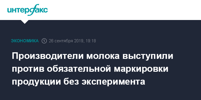 Москва. 26 сентября. INTERFAX.RU - Госкомиссия одобрила введение обязательной маркировки всей готовой молочной продукции с 1 июня 2020 года, сообщил через пресс-службу Минпромторга глава министерства Денис Мантуров. Производители молока обеспокоены этими планами и настаивают, что сначала нужно провести эксперимент по маркировке и оценить, нужна ли она вообще.