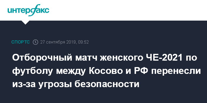 "УЕФА сообщил Российскому футбольному союзу о переносе матча отборочного турнира ЧЕ-2021 между национальными женскими сборными Косово и России, запланированного на 4 октября в Приштине (столица Косово - ИФ). Такое решение было принято по соображениям безопасности", - говорится в сообщении пресс-службы Российского футбольного союза (РФС) в пятницу.