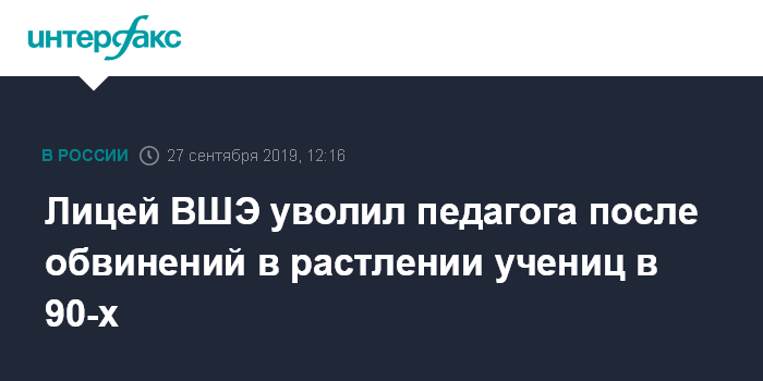 Москва. 27 сентября. INTERFAX.RU - Руководство лицея Высшей школы экономики (НИУ ВШЭ) разорвало контракт с учителем литературы Александром Кузнецовым, которого бывшие ученицы обвинили в растлении, запугивании и шантаже. Трудовые отношения с ним прекращены с 25 сентября, сообщили в пресс-службе НИУ ВШЭ.