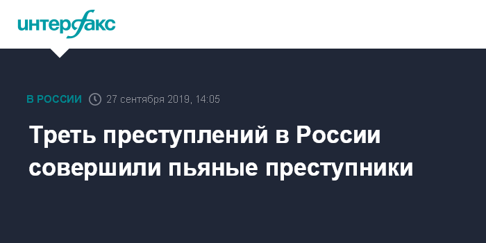 Москва. 27 сентября. INTERFAX.RU - Более половины всех преступлений в России с начала года совершено рецидивистами, а каждое третье преступление совершается в нетрезвом состоянии, сообщили "Интерфаксу" в Генпрокуратуре РФ.