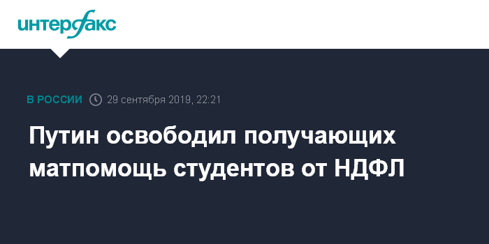 Москва. 29 сентября. INTERFAX.RU - Президент России Владимир Путин 29 сентября подписал закон, освобождающий студентов и аспирантов от уплаты налога на доходы физических лиц (НДФЛ) при получении материальной помощи в случае, если ее сумма за год не превышает 4 тысяч рублей, соответствующий документ был опубликован на официальном интернет-портале правовой информации в воскресенье.