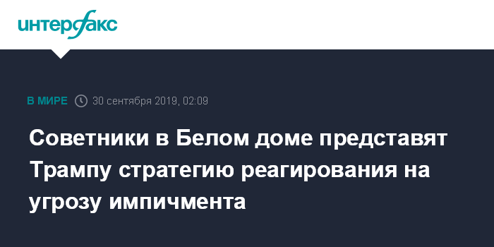 Москва. 30 сентября. INTERFAX.RU - Советники аппарата Белого дома планируют представить президенту Дональду Трампу широкомасштабную стратегию реагирования на растущую угрозу импичмента в ближайшие дни, сообщает телеканал NBC.