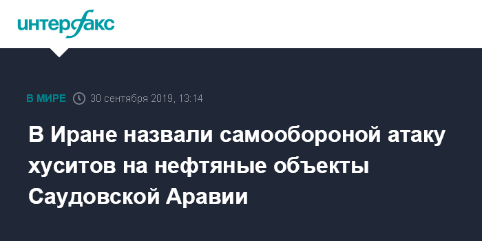 Москва. 30 сентября. INTERFAX.RU - В Иране продолжают критиковать Саудовскую Аравию за военные действия против мятежников-хуситов в Йемене и оправдывают атаку на нефтяные объекты компании Saudi Aramco, считая ее оборонительными действиями, передает агентство "Мехр".