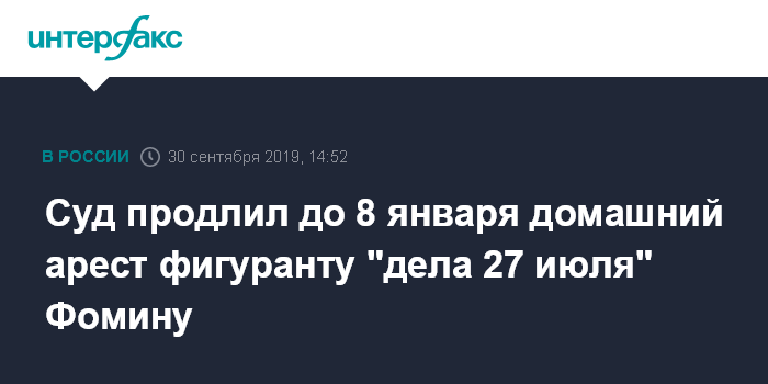 Москва. 30 сентября. INTERFAX.RU - Басманный суд продлил до 8 января домашний арест Сергею Фомину, который обвиняется в участии в массовых беспорядках в Москве 27 июля. Об этом сообщила пресс-секретарь суда Юнона Царева.