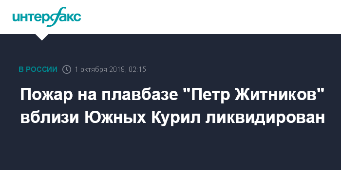 Москва. 1 октября. INTERFAX.RU - Пожар на плавбазе "Петр Житников" в Тихом океане возле Итурупа (Южные Курилы Сахалинской области) ликвидирован, судно готовят к переходу на ремонт, сообщили агентству "Интерфакс" в морском спасательном координационном центре "Южно-Сахалинск" во вторник.