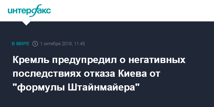 Москва. 1 октября. INTERFAX.RU - Пресс-секретарь президента РФ Дмитрий Песков предупредил, что отказ Киева от "формулы Штайнмайера" "существенно затормозит весь процесс" урегулирования конфликта в Донбассе.
