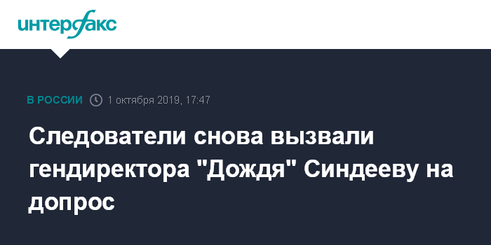 Москва. 1 октября. INTERFAX.RU - Генерального директора телеканала "Дождь" Наталью Синдееву вновь вызвали на допрос к руководителю следственной группы по "московскому делу".