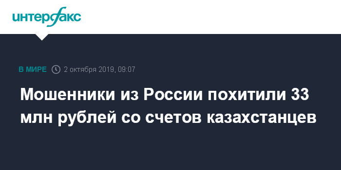 Москва. 2 октября. INTERFAX.RU - Около 200 млн тенге (примерно 33 млн рублей) похитили мошенники из России со счетов граждан Казахстана, сообщил первый заместитель главы МВД республики Марат Кожаев.