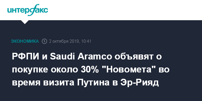 РФПИ и Saudi Aramco объявят о покупке около 30% "Новомета" во время визита Путина в Эр-Рияд