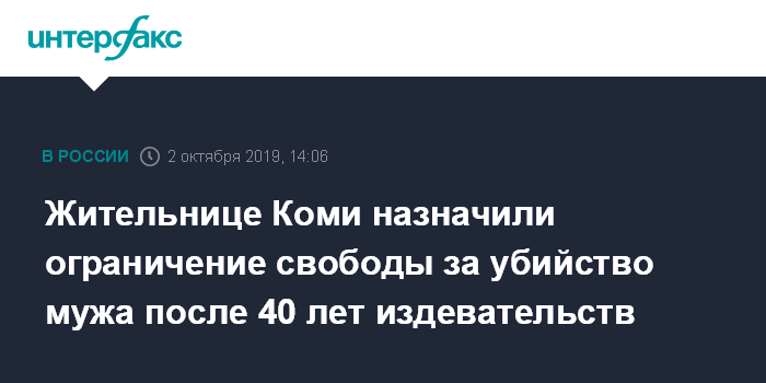Москва. 2 октября. INTERFAX.RU - Прилузский районный суд Коми приговорил местную жительницу к восьми месяцам ограничения свободы за убийство в состоянии аффекта мужа, который издевался над ней 40 лет.