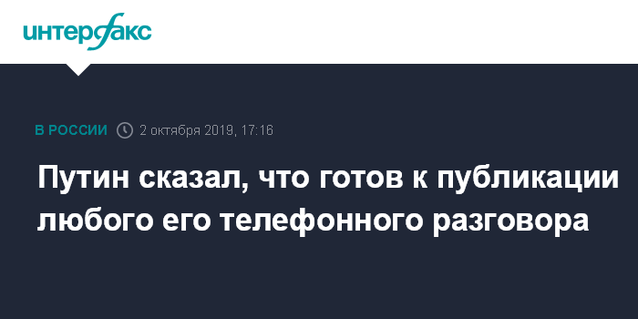 Москва. 2 октября. INTERFAX.RU - Президент Владимир Путин всегда исходит из того, что любой его разговор может быть опубликован. Так он на "Российской энергетической неделе" ответил на вопрос, готов ли он, если Белый дом опубликует стенограмму его телефонного разговора с президентом Дональдом Трампом.