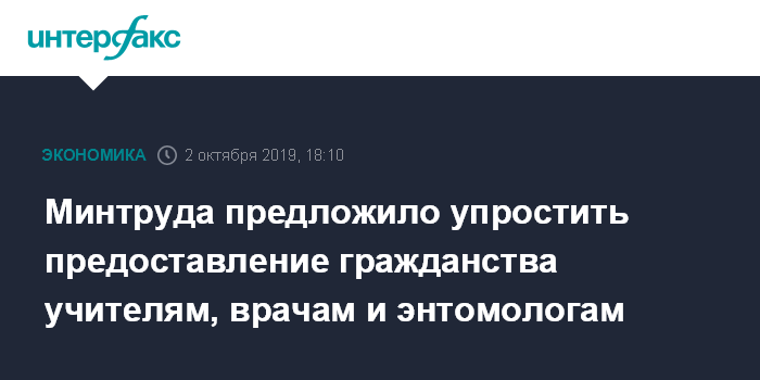 Москва. 2 октября. INTERFAX.RU - Минтруда предложило предоставить право на упрощенный порядок предоставления российского гражданства специалистам определенных профессий, которые живут в России и проработали по специальности не меньше года. К опубликованному проекту приказа ведомства приложен список из 135 профессий, специальностей и должностей, от агроинженера до энтомолога.