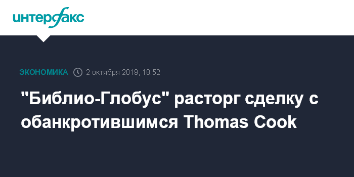 Москва. 2 октября. INTERFAX.RU - Российский туроператор "Библио-Глобус" расторг сделку купли-продажи с обанкротившимся британским холдингом Thomas Cook. Об этом говорится в сообщении компании.