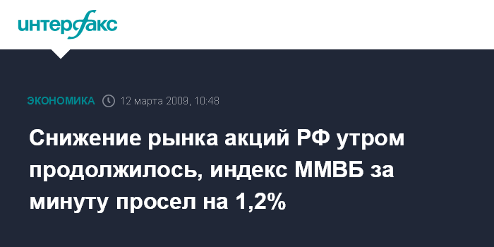 Москва. 12 марта. INTERFAX.RU - Снижение российского рынка акций утром в четверг продолжилось вслед за мировыми фондовыми площадками и нефтью, индекс ММВБ за минуту потерял 1,2%.