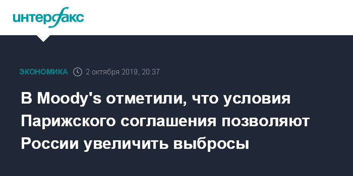 Москва. 2 октября. INTERFAX.RU - Выполнение Россией требований Парижского соглашения по климату не приведет к существенным последствиям для российских компаний в ближайшие годы, эти требования слишком мягкие и позволяют России даже нарастить выбросы парниковых газов, считают эксперты международного рейтингового агентства Moody's. Россия обязалась снизить уровень выбросов на 25% от уровней 1991 года к 2020 году и на 25-30% - к 2030 году.