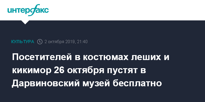 Москва. 2 октября. INTERFAX.RU - 26 октября в Дарвиновском музее в Москве пройдет День Лешего. Посетителей в костюмах лешего, кикимор и другой лесной нечисти в этот день пустят в музей бесплатно, пообещали в пресс-службе организации.