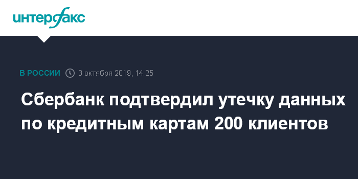 Москва. 3 октября. INTERFAX.RU - Сбербанк России подтвердил утечку данных по кредитным картам 200 клиентов, информация об утечке большего массива информации проверяется службой безопасности и пока не подтверждена, следует из сообщения Сбербанка в его группе "ВКонтакте".