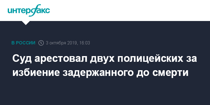 Москва. 3 октября. INTERFAX.RU - В Вольске суд арестовал на два месяца двух полицейских, которых обвиняют в избиении задержанного до смерти. Об этом сообщила пресс-служба Саратовского управления Следственного комитета.
