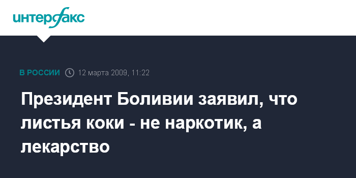 Москва. 12 марта. INTERFAX.RU - Президент Боливии Эво Моралес призвал исключить листья коки из международного списка наркотических веществ. Выступая на сессии Комиссии ООН по наркотическим средствам в Вене, Э.Моралес стал жевать лист коки, заявив, что этим хочет привлечь внимание к своей инициативе исключить коку из международного списка запрещенных наркотических веществ, сообщает в четверг служба новостей ООН.