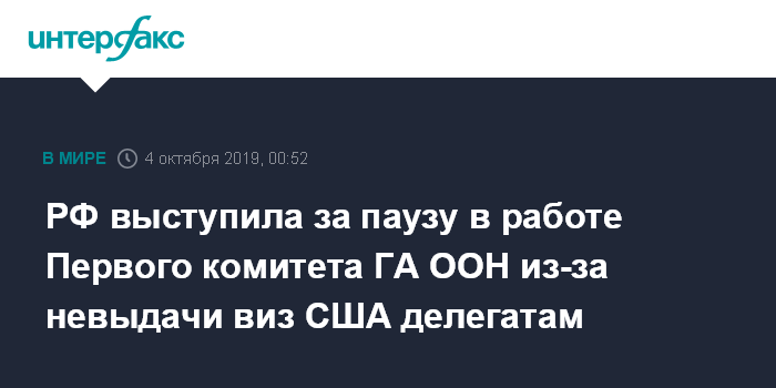 Москва. 4 октября. INTERFAX.RU - Россия предлагает взять процедурную паузу в работе Первого комитета Генассамблеи ООН и перейти в режим неформальных консультаций, пока США не выдадут визы всей российской делегации, заявил зампостпреда РФ при ООН Дмитрий Полянский.