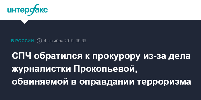 Как сообщает пресс-служба СПЧ, внимательно изучив текст выступления Прокопьевой, постоянная комиссия по свободе информации и правам журналистов не усмотрела в нем никаких признаков оправдания терроризма, указанных в примечании 1 к ст. 205.2 УК РФ.