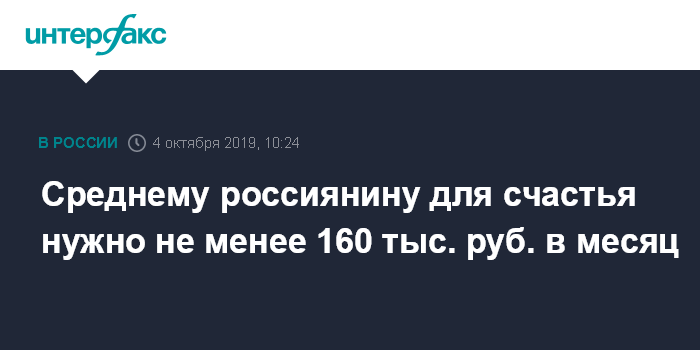 Среднему россиянину для счастья нужно не менее 160 тыс. руб. в месяц